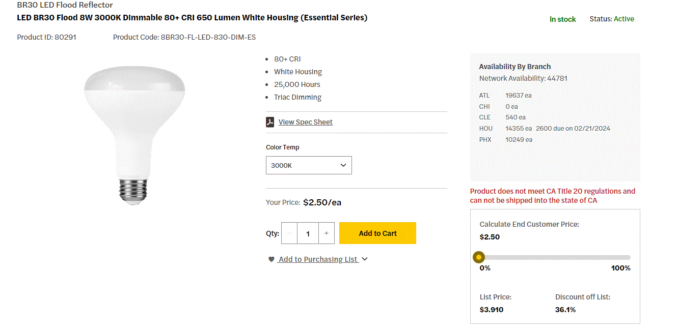 8BR30DIM927 LED 8W=65W BR30 2700K CRI-92 E26-MEDIUM SCREW 120V DIMMABLE 720LM 25000HRS **JA8/T20/ENCLOSED/ENERGY STAR RATED** 5.25"L X 3.75"D 0.22LBS EA |