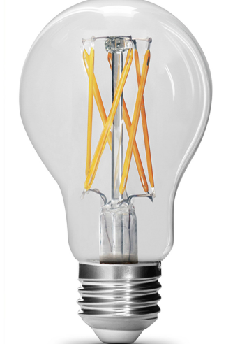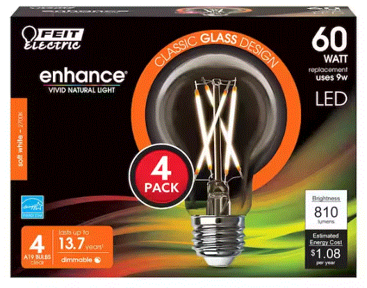 A1960CL927CA/FIL/4 9W CLEAR A19 FILAMENT LED E26-MEDIUM SCREW BASE 120V =60W 2700K CRI-90 810LM DIMMABLE 15000HRS T20/COMPLIANT DAMP LOCATION/ENERGY STAR RATED 4-PK L 4.3" D 2.4" |