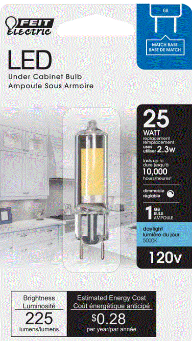 BP25G8/850/LED 2.3W CLEAR T4 LED G8-BIPIN BASE =25W 120V 5000K CRI>80 225LM 10000HRS ENCLOSED/DAMP/DIMMABLE RATED L 2.00" D 0.60" |