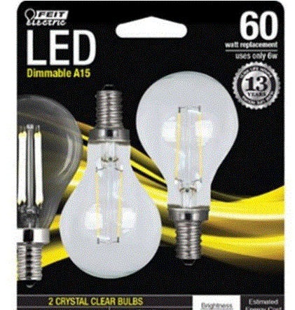 BPA1560W/927CA/FIL/2 LED DIMMABLE A15 FILAMENT WHITE E26 750LM 60W EQ 2700K CEC COMPLIANT TITLE 24 NOT TITLE 20 COMPLIANT |