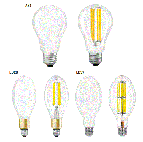 LED39ED28/UNVCL850/MED 39W LED ED28 CLEAR GLASS FILAMENT E26-MEDIUM SCREW BASE =150W HID 5000K CRI>80 6000LM PHASE-CUT DIMMING 50000HRS OPEN/ENCLOSED RATED L 8.86" D 3.54" 0.71LBS |