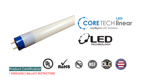 L48T8/840/15P-XT/BAA/TAA CORETECH WATTAGE SELECT 48"/4' NANO-PLASTIC T8 G13-MEDIUM BIPIN BASE 10W/12W/15W 4000K CRI-82 1600LM/1800LM/2200LM SHATTERPROOF 0-10V DIMMING 325D BEAM ANGLE TYPE C-LED DRIVER REQUIRED 50000HRS NSF2 RATED BAA & TAA COMPLIANT |