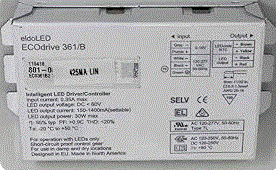 EC0361B3-350MA-LIN-OEMSS01-J40 eldoLED CC LED DRIVER ECO361B3 30W SQUARE METAL W/BOTTOM FEED, 120-277VAC AND 20-250VDC/IN, 60VDC/OUT 200-1400MA (PROGRAMMED TO 350mA) PF>0.90, 0- DIMMING TO 10%, 5.12"L X 2.83"W X 1.35"H 0.62LBS EA |