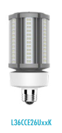 L36CCE26H50K 36W = 175W HID LED REPLACEMENT CORN COB E26-MEDIUM SCREW BASE 5000K CRI>85 5400LM 277-480V TYPE B-BALLAST BYPASS DIMMABLE 50000HRS 7.9"L X 3.3"D 1.65LBS EA |