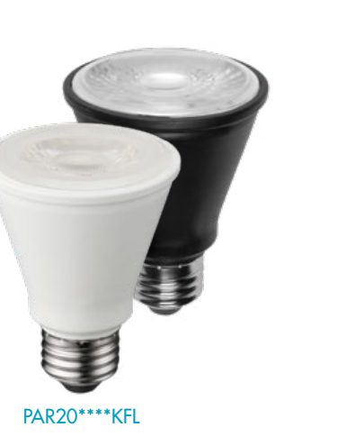 L7P20D2527KNFL 7W 120V LED PAR 20 E26 MEDIUM BASE 80CRI 2700K 600LU NARROW FLOOD 25DEG ENCLOSED/WET LOCATION RATED WHITE HOUSING |