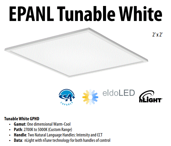 EPANL-2X2-4800LM-80CRI-30K-MIN1-MVOLT-CL80-NLIGHT 41.4W 2X2 LED TUNABLE FLAT PANEL 3000K 4800LM 120V-277V DIMMING TO 1% L 23.70" W 23.70" D 2.19" 14.66LBS |