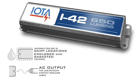I-42-A IOTA FLUORESCENT EMERGENCY BALLAST FOR 4-PIN 1L 10W-42W OR 2L 10W-18W 650LM 90MIN OPERATING TIME DUAL FLEX I42AM5 NOT CA/COMPLIANT 9.5"L 2.4"W 1.5"H 4.00 LBS |