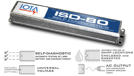 ISD-80 IOTA SELF DIAGNOSTIC FLUORESCENT EMERGENCY BALLAST 3.5W 110-277V FOR USE WITH MOST 2`-8` SINGLE PIN, BIPIN T8 & T12 HO OR VHO FLUORESCENT LAMPS AND 2'-4' 28W- 54W T5 LAMPS 90-MIN RUN TIME 13.3"L 2.38"W 1.5"H 3.6LBS *NOT T20 COMPLIANT* |