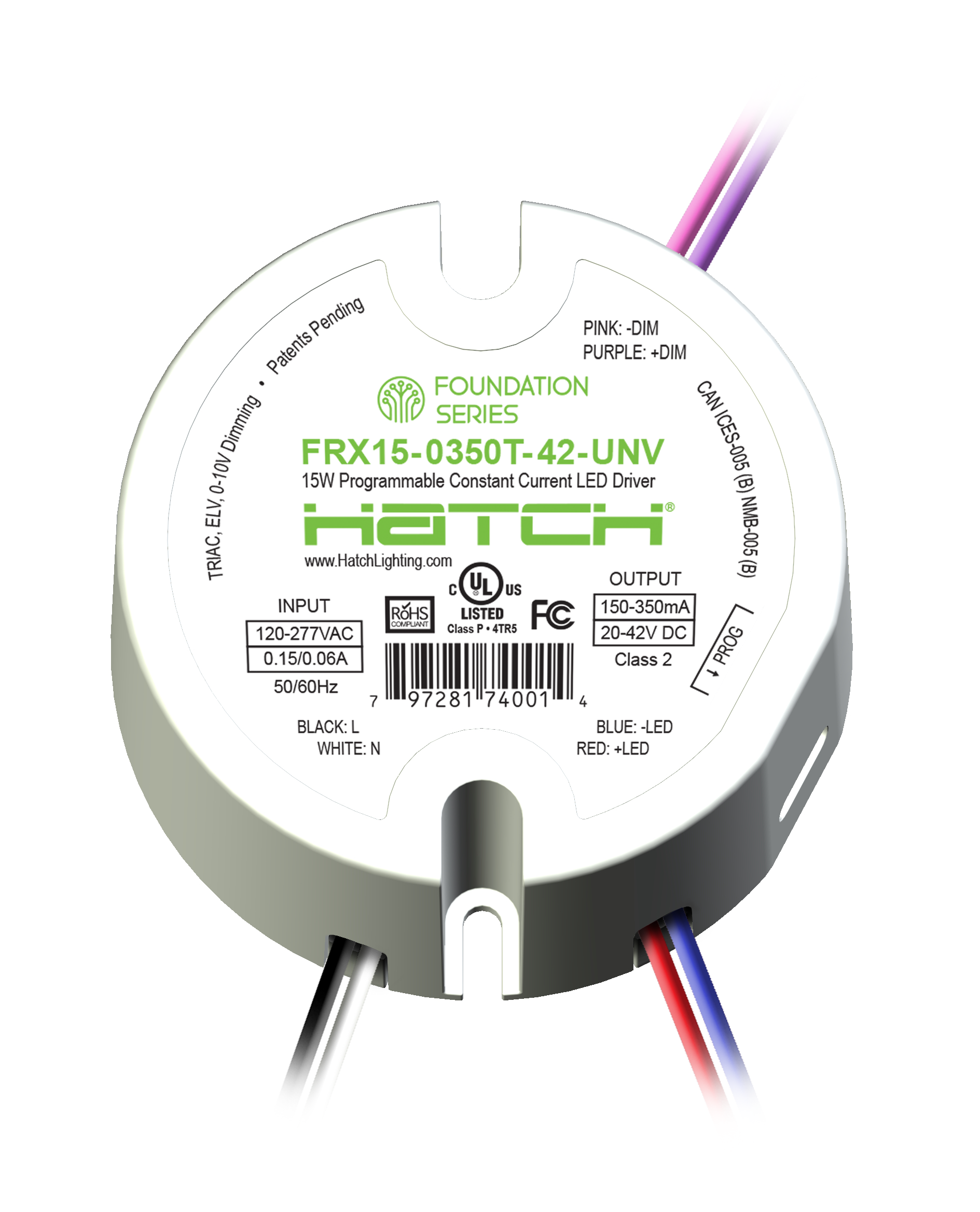 FRX15-0350T-42-UNV 15W CC ROUND LED DRIVER 120V-277VAC INPUT 20V-42VDC OUTPUT 150-350mA 350mA DEFAULT TRIAC ELV 0-10V DIMMING SIDE LEADS **IN HOUSE PROGRAMMING D 2.58" H 1.18" |