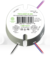FRX15-0500T-30-UNV 15W CC ROUND LED DRIVER 120V-277VAC INPUT 15V-30VDC OUTPUT 200-500mA DEFAULT 500mA TRIAC ELV 0-10V DIMMING SIDE LEADS IN HOUSE PROGRAMMING D 2.58" H 1.18" |