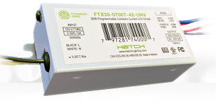 FTX30-0700T-42-UNV 30W PROGRAMMABLE LED DRIVER CONSTANT CURRENT CC 120-277VAC-IN 20-42VDC-OUT 700mA DEFAULT 350mA-700mA RANGE DIMMABLE TRIAC/LEADING ELV/TRAILINGEDGE 0-10V SIDE LEAD EXIT ***IN HOUSE CUSTOM PROGRAMMING*** L 3.67" W 1.61" H 1.10" |