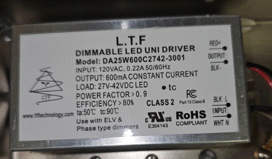 DA25W600C2742-3001 25W LED DRIVER CC-CONSTANT CURRENT 120VAC-IN 600mA 27V-42VDC-OUT ELV & PHASE TYPE DIMMABLE PF:>0.90 LEADS ON 1 SIDE L 4.33: W 2.17" H 0.98" LTF |