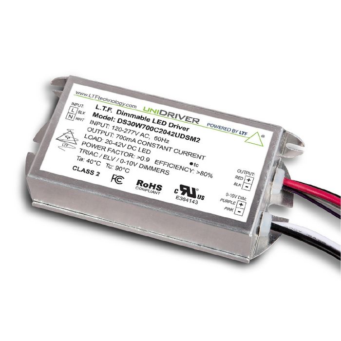 DS30W700C2042UDSM2 30W LED DRIVER CC-CONSTANT CURRENT 90V-305VAC-IN 700mA 20V-42VDC-OUT TRIAC ELV 0-10V DIMMING 30W MAX PF:>0.90 WIRE LEADS ONE SIDE IP66 LTF L 4.33" W 2.17" H 0.98" |