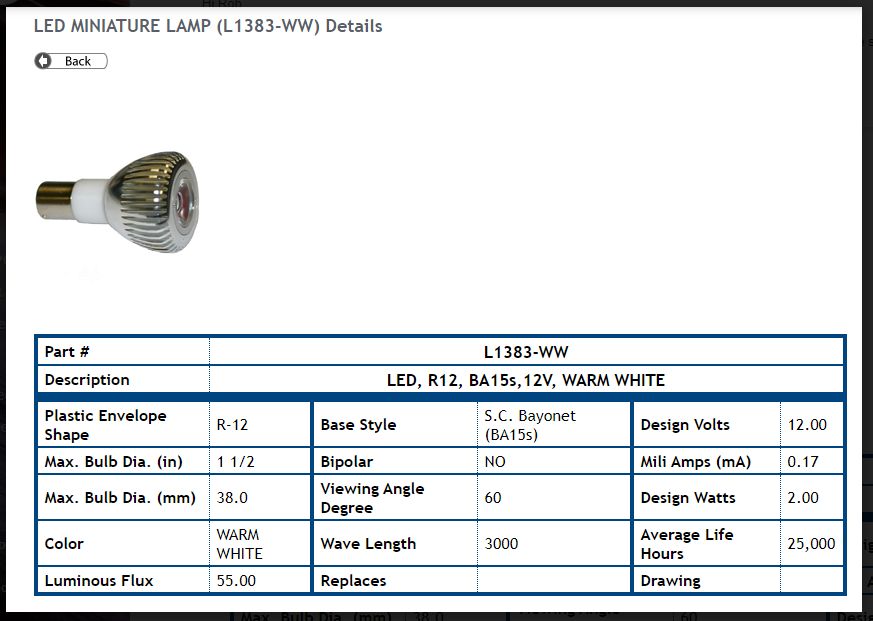 2W LED R12 REFLECTOR SINGLE CONTACT BAYONET BASE SCB BA15S 2700K 12V 55LM =20W 1383 ELEVATOR BULB 80CRI WIDE FLOOD 60DEG 25,000HRS 2.5"MOL 1.5"DIA