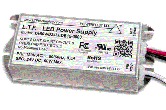 60W LOW VOLTAGE ELECTRONIC TRANSFORMER 120VAC-IN 24VDC-OUT FOR LED STRIPS LED BULBS INCANDESCENT AND HALOGEN W/ELV DIMMING NO MIN LOAD IP60 B15 CASE W/WIRED LEADS L 2.78" W 1.57" H 0.89"