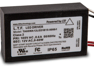 60W ELECTRONIC TRANSFORMER 277VAC-IN 12VAC-OUT 0W MINIMUM ELV DIMMABLE LED INCANDESCENT HALOGEN BULBS PF:>0.98 IP60 LTF L 1.80" W 1.60" H 0.90" 0.30LBS