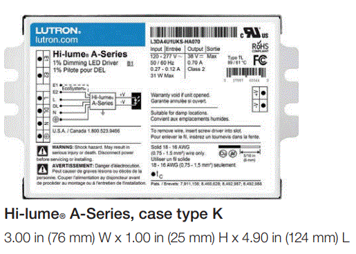 L3DA4U1UKS-FA065 40W LUTRON CC CONSTANT CURRENT DRIVER K COMPACT STUDDED CASE 120V-277VAC/IN 510mA-1000mA 30V-54VDC/OUT CONSTANT REDUCTION CCR DIMMING L 4.90" W 3.00" H 1.00" **NON-CANCELLABLE;** |