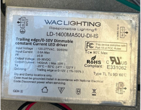 LD-1400MA50U-DI-IS 50W LED DRIVER CC CONSTANT CURRENT 120-277VAC 20-36VDC 1400mA TRAILING EDGE 0-10V DIMMING >.9 POWER FACTOR WAC LIGHTING **NO FORMAL VENDOR SPEC** |