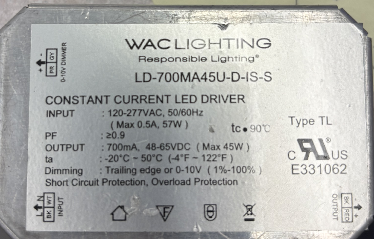 LD-450MA16U-DIM-IS WAC 16W CC CONSTANT CURRENT LED DRIVER 120-277VAC-IN 15-36VDC-OUT 450mA TRAILING EDGE OR 0-10V DIMMING PF>0.90 |