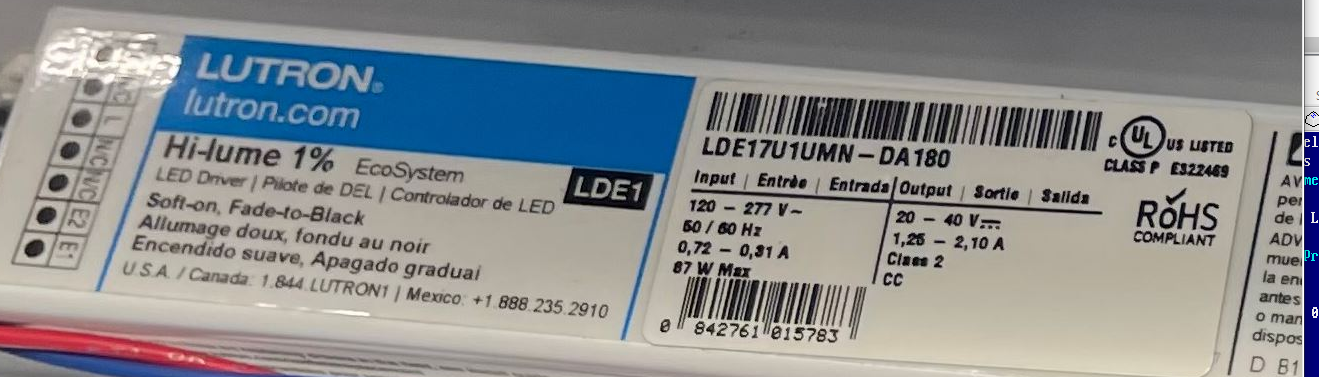 LDE57U1MN-DA155 LUTRON 5 SERIES ECOSYSTEM LED DRIVER 1.55A 120-277V IN 22.6-40V OUT CONTINUOUS DIMMING TO 5% OF FULL OUTPUT CURRENT |