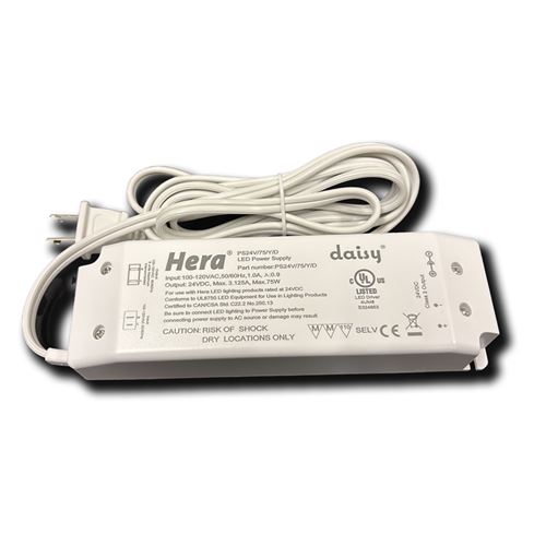 PS24V/75/Y/D HERA LIGHTING 75W CV CONSTANT VOLTAGE LED POWER SUPPY 100-120VAC-IN 24VDC-OUT 3125mA NON-DIM 79" CORD W/ 2-PIN PLUG-IN PF>0.9 |