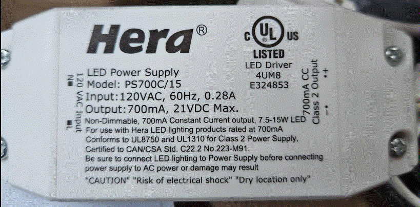 PS700C/15H 15W LED DRIVER 120VAC-IN 700mA 21VDC-OUT WIRE LEADS NON-DIM CLASS 2 HERA DRIVER |