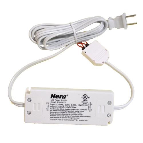 PSLED/10 HERA 10W CC CONSTANT CURRENT POWER SUPPLY 120VAC-IN 34VDC-OUT 350MA NON-DIM WALL PLUG 5.0"L 2.0"W 0.5"H |