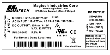 Q12-U12-C0175-XP 12W LED DRIVER CC CONSTANT CURRENT 110-277VAC INPUT 6-12VDC OUTPUT 175mA 0-10V DIMMING DRY AND DAMP LOCATION RATED |