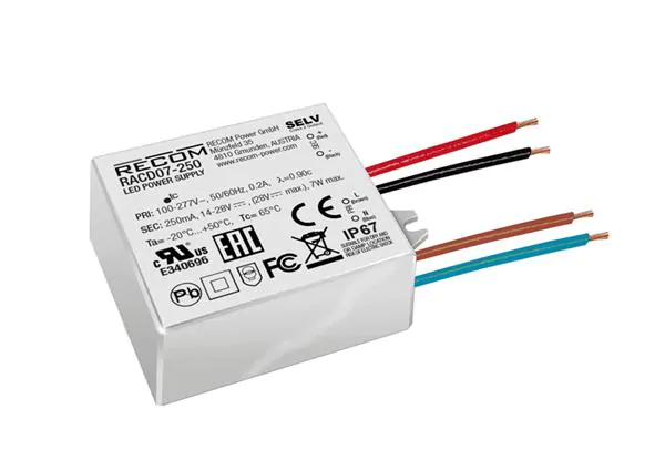 RACD06-500 6W CC-CONSTANT CURRENT LED DRIVER 90V-264VAC/IN 500mA 3V-14VDC/OUT NON-DIM IP65 L 2.67" W 1.38" H 0.83" 0.09LBS |