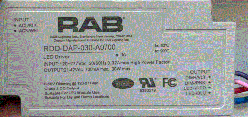 RDD-DAP-030-A0700 30W LED DRIVER CC-CONSTANT CURRENT 120V-277VAC-IN 700mA 21V-42VDC-OUT 0-10V DIMMING @ 120V-277VAC DRY/DAMP LOCATION RATED RAB LIGHTING |
