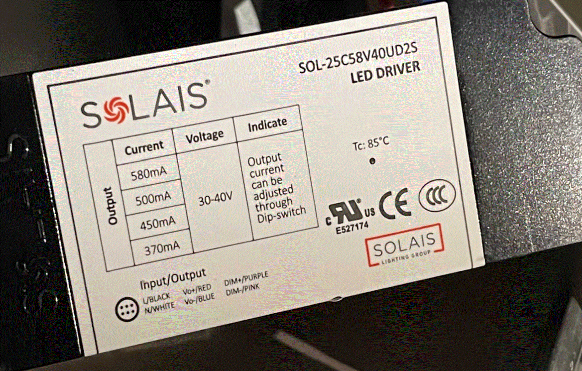 SOL-25C58V40UD2S 25W LED DRIVER CC-CONSTANT CURRENT 120V-277VAC-IN 370mA 450mA 500mA 580mA DIP SWITCH CONTROLLED 30V-40VDC-OUT 0-10V DIMMING SOLAIS |