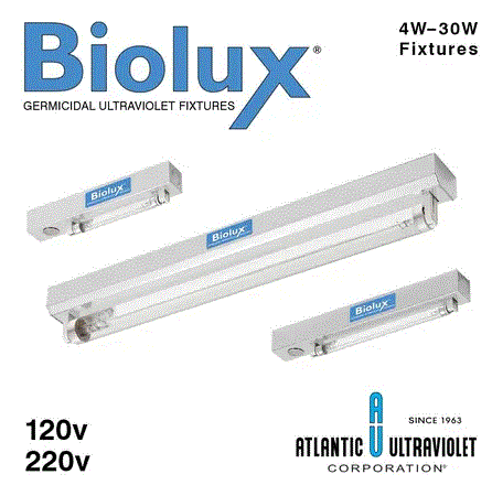BIOLUX-30 30W BIOLUX GERMICIDAL ULTRAVIOLET STRIP FIXTURE AIR & SURFACE IRRADIATING W/G30T8 05-1106-R 254nm LAMP INCLUDED 9000 LAMP HRS L 37.50" W 2.63" H 3.50" |