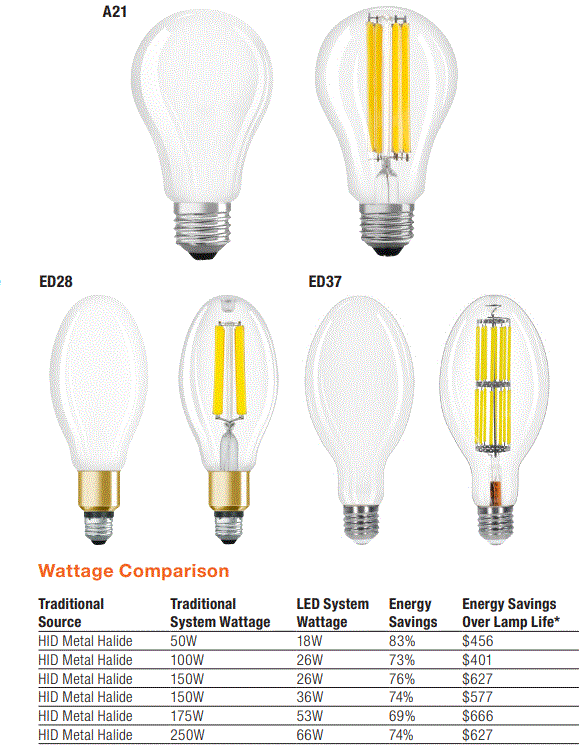 LED66ED37UNVCL850MOG 66W CLEAR GLASS ED37 FILAMENT LED E39-MOGUL SCREW BASE =250W 120V-277V OMNI-DIRECTIONAL 5000K CRI>80 10000LM PHASE-CUT DIMMING 6kV SURGE PROTECTION OPEN/ENCLOSED RATED 25000HRS L 10.2" D 4.7" 1.08LBS |