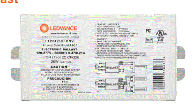 LTP2X26CFUNVDM 1L 2L FLUORESCENT ELECTRONIC BALLAST 120-277V 26W 32W 42W CFL T4 PROGRAM START DUAL MOUNT SIDE LEADS L 5.05" W 2.42" H 0.9" 0.48LBS |