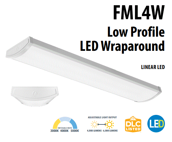 FML4W-48-5000LM-835-ZT-MVOLT 53.4W FML4W 48"/4' LED LOW PROFILE WRAPAROUND FIXTURE 120V-277V 3500K CRI>80 5000LM 0-10V DIMMING TO 10% TRIAC @ 120V ONLY LINE VOLTAGE L 47.88" W 10.00" H 3.00" 6.60LBS |