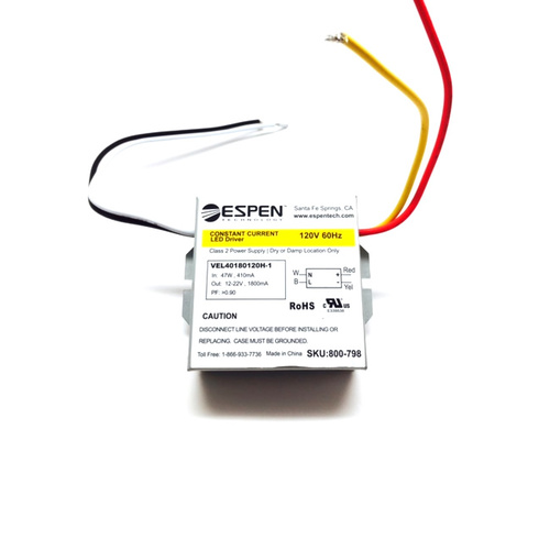 VEL6700120H 16.5W LED DRIVER CC-CONSTANT CURRENT 120VAC/IN 500mA 18V-33VDC/OUT NON-DIM W/WIRE LEADS ESPEN L 2.85" W 2.40" H 1.13" 0.75LBS |
