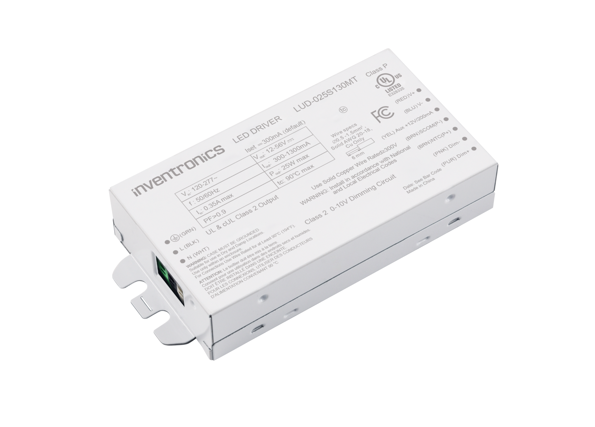 LUD-025S130MT 25W LED DRIVER CC-CONSTANT CURRENT 120V-277VAC-IN 300mA-1300mA 10V-56VDC-OUT 25W MAX PWM/0-10V DIMMING W/12V AUX @ 200mA 50000HRS QUICK CONNECT W/GREEN GROUND IP20 |