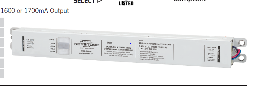 KTLD-60-UV-1750-VDIM-AR1 60W 120-227VAC-IN 10-34VDC-OUT 1750MA CC LED DRIVER 0 - 10V DIMMABLE IP66 6.48" X 1.67" X 1.26" KEYSTONE REMOTE MOUNTING DISTANCE 23FT |