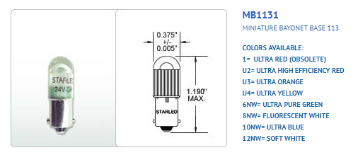 MB1131WC8NW-6V/45-DP-I LED 0.06 - 0.48W 6V T3.25 MINIATURE BAYONET - BA9S 1.19"MOL 0.38"DIA STARLED WHITE |