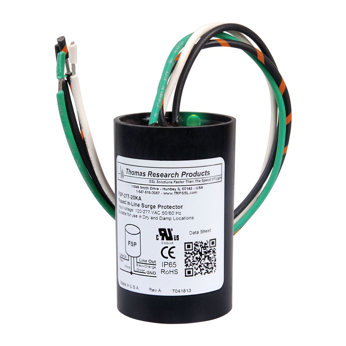 FSP3-277-20KA-C01 277VAC MAIN OR 120V THROUGH 277V UNIVERSAL INPUT FSP3 SERIES 3 POLE FUSED IN-LINE SURGE PROTECTOR WITH LED INDICATOR FOR LED DRIVERS FOR WITH 20KA PROTECTION 7.0A/7000MA CONTINOUS MAX CURRENT 320VAC/420VDC OPERATING VOLTAGE 10KA-IN NOMINAL CURRENT 2100V MAX CLAMPING VOLTAGE @ 20KA IP65 UL1449 IEC 61643-11 AND 8.3.4.3 COMPLIANT 2.95" H 1.89" DIA |