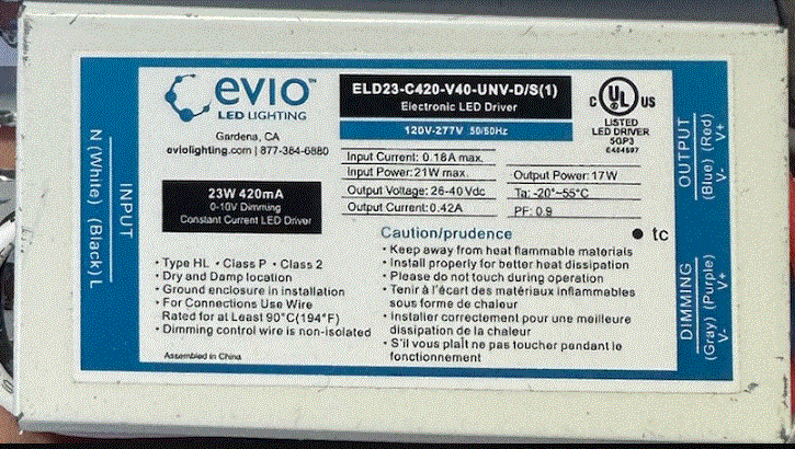 ELD23-C420-V40-UNV-D/S 23W LED DRIVER CC-CONSTANT CURRENT 120V-277VAC-IN 420mA 26V-40VDC-OUT 0-10V DIMMING PF:>0.90 DAMP LOCATION RATED WIRE LEADS SMALL RECTANGULAR CASE |