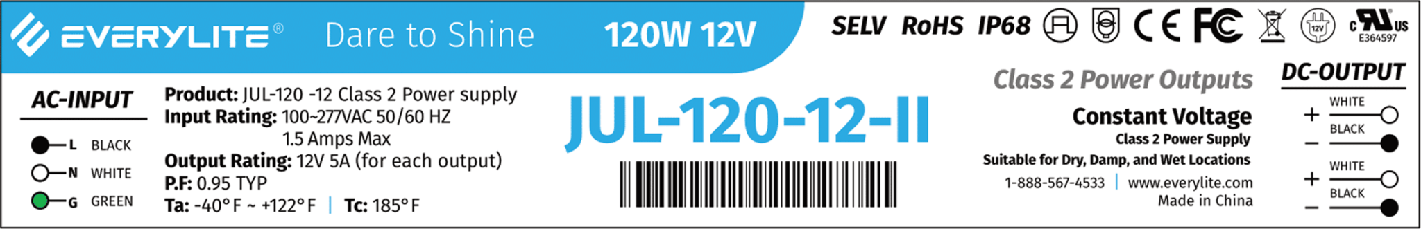 JUL-120-12-II 120W CV-CONSTANT VOLTAGE LED DRIVER 2-CHANNEL/2CH 60W PER CHANNEL 5000mA PER CHANNEL 12VDC/OUT PER CHANNEL PF:0.95 IP68 W/GREEN GROUND L 7.55" W 2.36" H 1.44" 1.65LBS |
